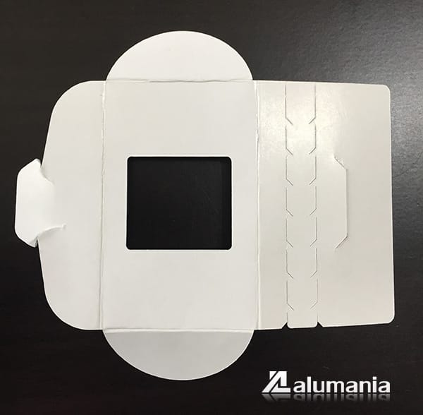 パッケージも商品同様に試作を作って検証します。こちら試作品の展開状態ですが、画像左側の部分が少し破れています。商品を入れてから折りたたみ、最後にその部分でロックをかける構造です。ロックした後には、開封すると、このような破れが発生するようになっています。概ね形状については固まってきましたので、これから印刷デザインを施して参ります。