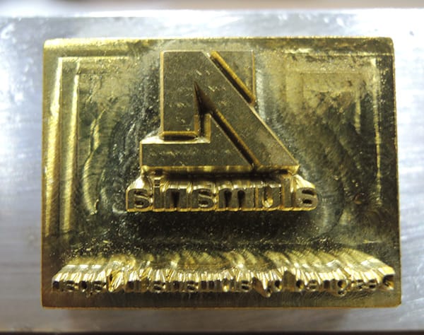 そのスタンプには熱伝導が高く加工しやすい真鍮製が一般的で、上から押し込みますので、彫り込まれる文字やロゴは逆になっています。色を付ける場合は、このスタンプと合皮の間にそれぞれの色の泊を挟んで押し込むと、その色が残るようにもできます。