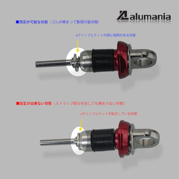 このeクリップとナットが結合している状態ではいくらストラップ部分を回しても(固定が完了しない)硬くなってきません。これは、ナットが移動できず、ゴムが膨張できないためです。