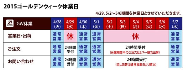 5月07日(木) ~ 通常営業となります。4/29及び、5/2~5/6までの期間は休業日とさせていただきます。期間中(5/2~5/6)のご注文分は翌営業日となる5/7のご注文分としてお取り扱いさせていただき、期間中は出荷作業ができませんので何卒ご承知おきください