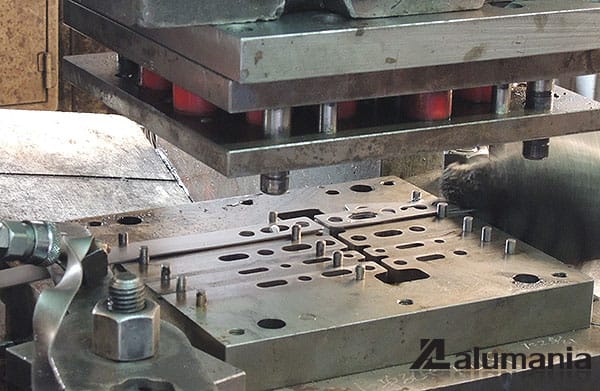 こちらの金型では4種類の平板幅がセットでき、ステー端のカットとブランクができるような金型になってます。各々目的別に材料の位置を作業者が変えて形状を形成しているように見えます。一度に全ての行程が出来上がる方法とは異なり、長さや幅、穴の数量など、汎用ステーの種類の多さに対応するための金型とも言えます。この記事の前後リンク