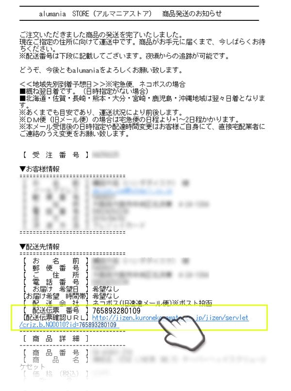 アルマニアストア内でご購入いただき、発送完了後に送信される「発送完了メール」内には、配送番号を記載させていただいており、その下段にヤマト運輸様の追跡確認先のリンクが貼られております。 今までは、配送番号をコピーしておく必要がございましたが、メール内のリンク先をクリックしますと、リンク先に飛んだ際にお客様の配送番号も自動で入力するように変更致しました。発送完了メールの内容