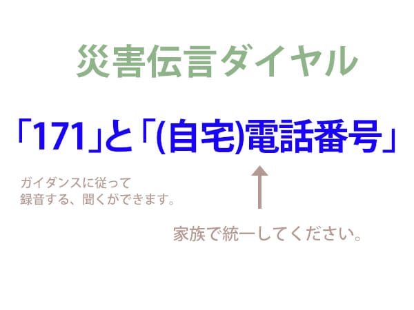 まずは「171」(いない)にダイヤルして、「電話番号」に紐付けてメッセージを残す、聞くことができます。一つだけ注意点としては、電話番号は家族間で統一しておく必要があります。基本的には自宅番号にすれば良いのですが、携帯電話番号でも登録ができますから、どれを使うか事前に決めておかなければ、せっかくメッセージを残しても違う番号でメッセージがない!となってしまいます。今一度、共通の番号はどれにするかを決めておいてください。とにかく、「171」+「自宅電話番号」が基本です。