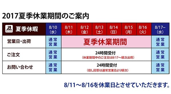 8月17日(木) ~ 通常営業となります。なお、期間中のお問い合わせにつきましても、基本的には8/17以降の順次ご回答とさせていただきますので、予めご承知おきのほど宜しくお願い致します。