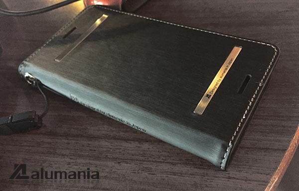 基本的にはシンプルにまとめたかった手帳型ケースですが、表紙は少しアクセントが欲しくなります。ヘアライン仕上げのプレートは無機質ではありますが光を反射しますので、画像のような暖かい光源下ではプレート部分が引き立ちます。